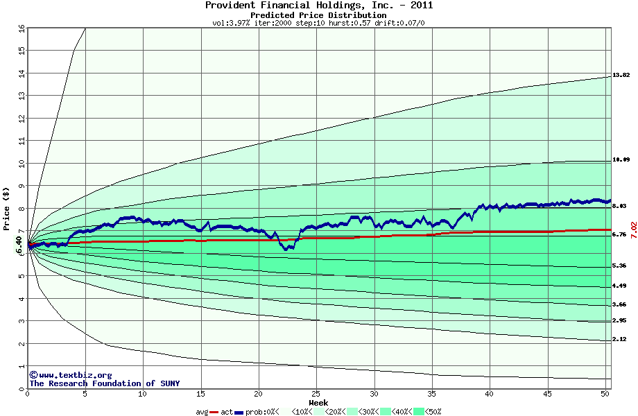 The following graph plots the year-to-date performance of the stock for 2011 compared to the probability calculated by a random walk model.