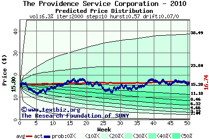 The high to date and low to date prices of the stock plotted against a random walk model for 2010 (what's this?).