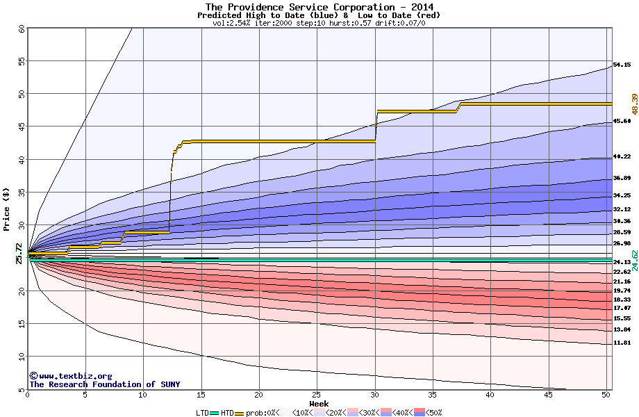 The high to date and low to date prices of the stock plotted against a random walk model for 2014 (what's this?).