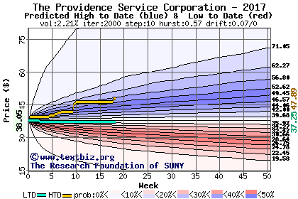 The high to date and low to date prices of the stock plotted against a random walk model for 2017 (what's this?).