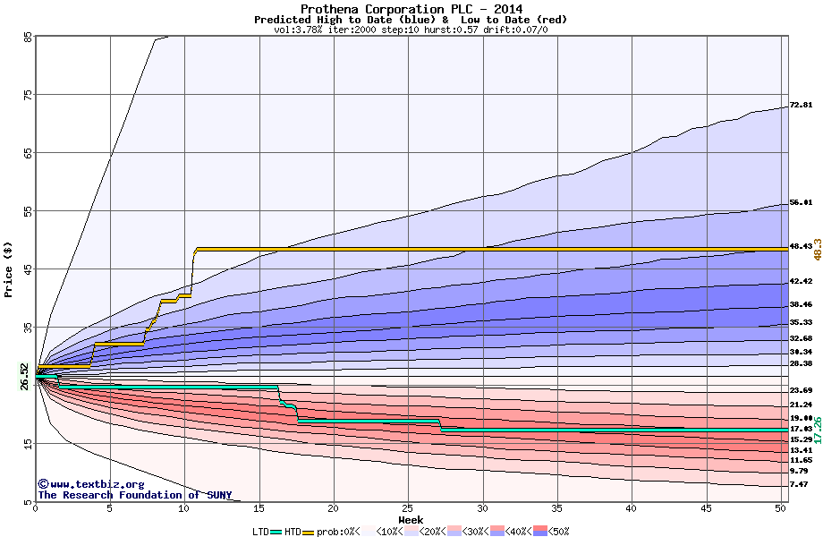 The high to date and low to date prices of the stock plotted against a random walk model for 2014 (what's this?).