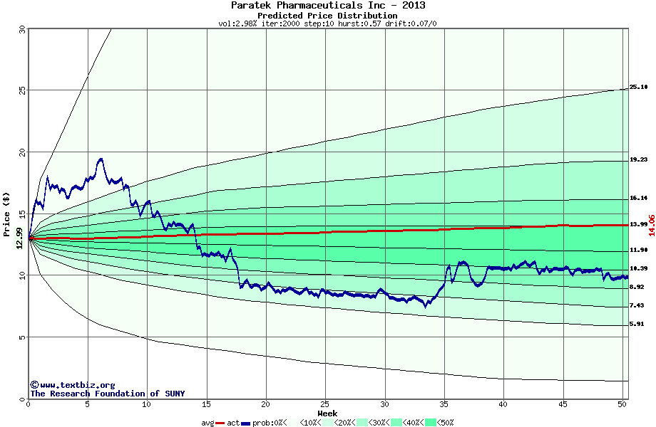 The following graph plots the year-to-date performance of the stock for 2013 compared to the probability calculated by a random walk model.