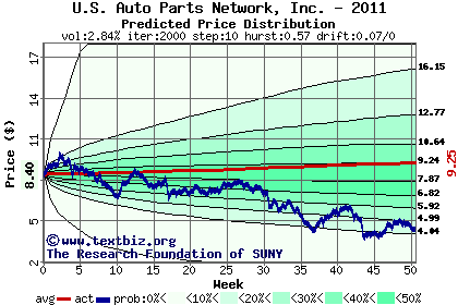 The high to date and low to date prices of the stock plotted against a random walk model for 2011 (what's this?).