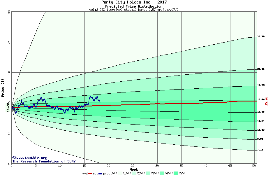 The following graph plots the year-to-date performance of the stock for 2017 compared to the probability calculated by a random walk model.