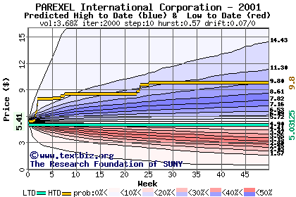 The high to date and low to date prices of the stock plotted against a random walk model for 2001 (what's this?).