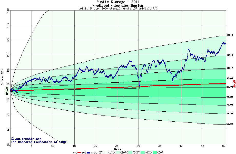 The following graph plots the year-to-date performance of the stock for 2011 compared to the probability calculated by a random walk model.