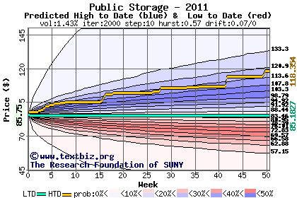 The high to date and low to date prices of the stock plotted against a random walk model for 2011 (what's this?).