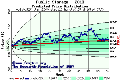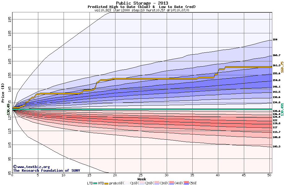 The following graph plots the year-to-date performance of the stock for 2013 compared to the probability calculated by a random walk model.