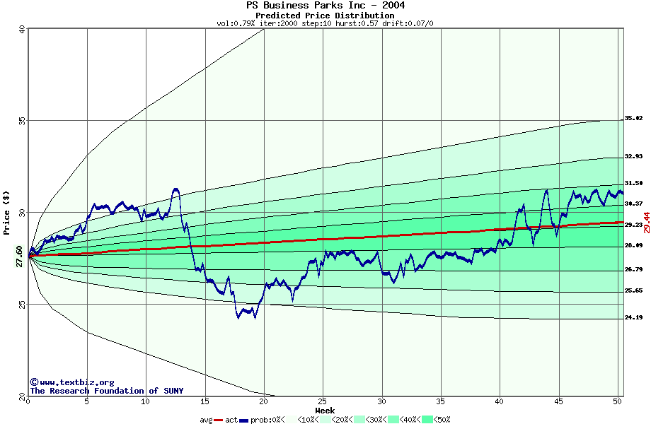 The following graph plots the year-to-date performance of the stock for 2004 compared to the probability calculated by a random walk model.