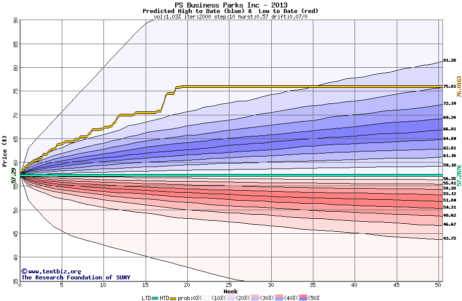 The following graph plots the year-to-date performance of the stock for 2013 compared to the probability calculated by a random walk model.