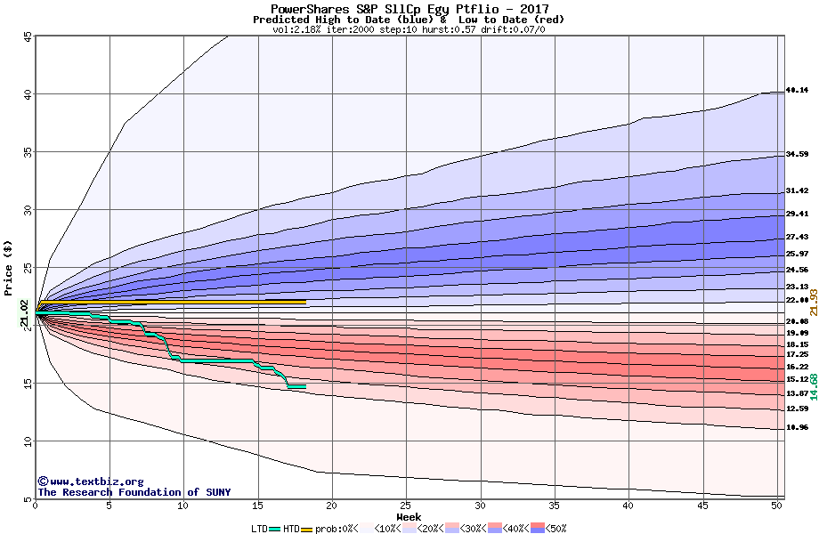 The high to date and low to date prices of the stock plotted against a random walk model for 2017 (what's this?).