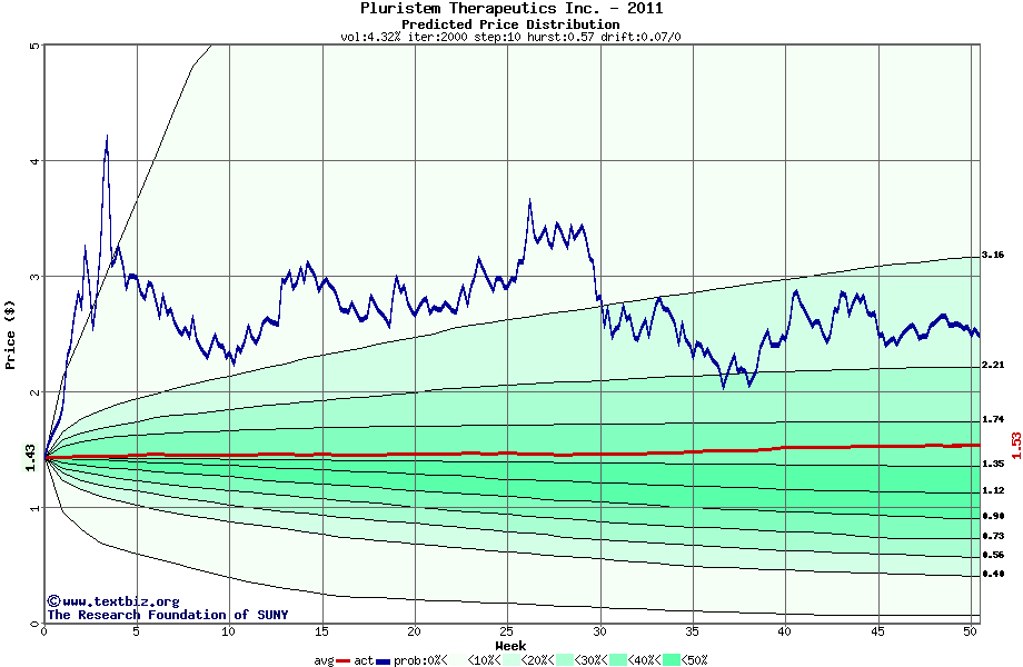 The following graph plots the year-to-date performance of the stock for 2011 compared to the probability calculated by a random walk model.