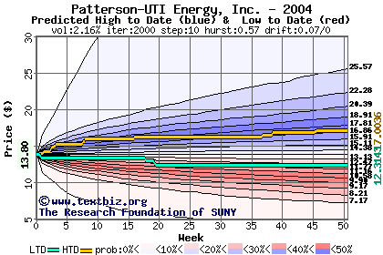 The high to date and low to date prices of the stock plotted against a random walk model for 2004 (what's this?).
