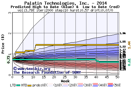 The high to date and low to date prices of the stock plotted against a random walk model for 2014 (what's this?).