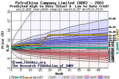 The high to date and low to date prices of the stock plotted against a random walk model for 2001 (what's this?).