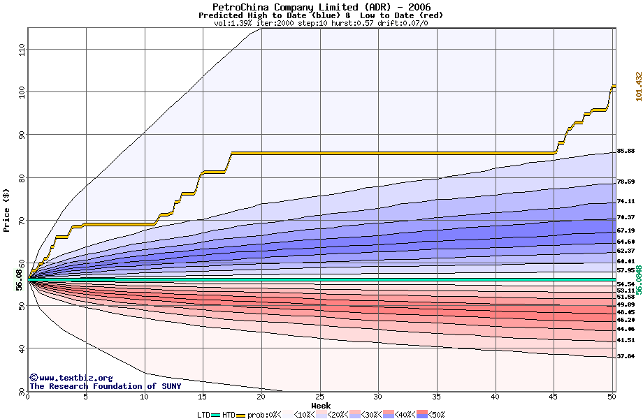 The high to date and low to date prices of the stock plotted against a random walk model for 2006 (what's this?).