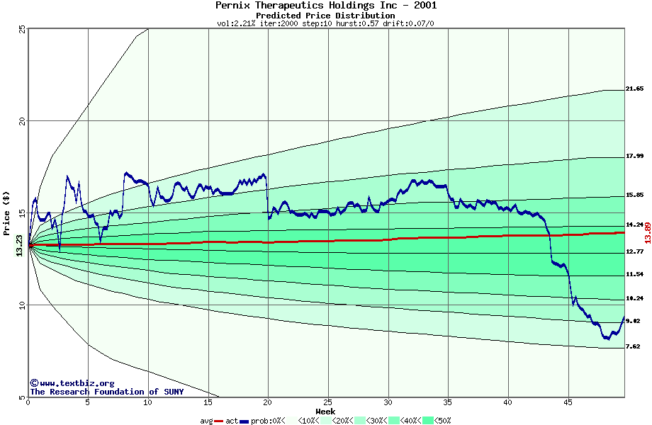 The following graph plots the year-to-date performance of the stock for 2001 compared to the probability calculated by a random walk model.