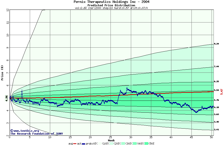 The following graph plots the year-to-date performance of the stock for 2004 compared to the probability calculated by a random walk model.