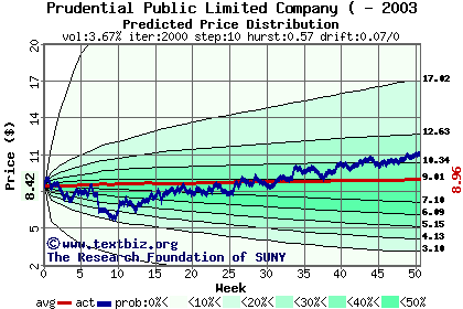 The high to date and low to date prices of the stock plotted against a random walk model for 2003 (what's this?).
