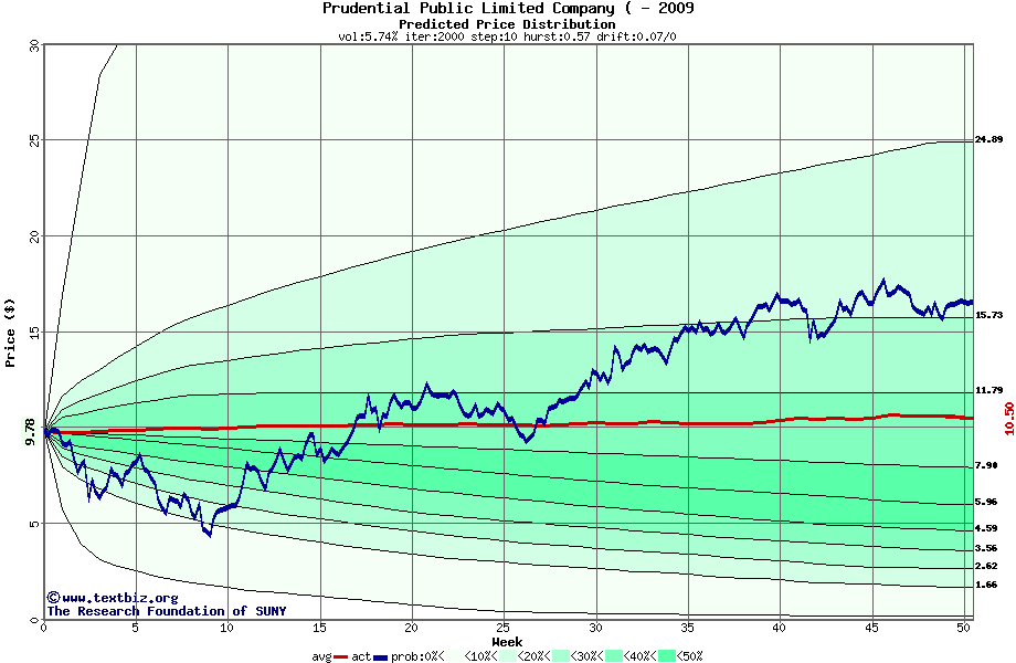 The following graph plots the year-to-date performance of the stock for 2009 compared to the probability calculated by a random walk model.