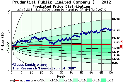 The high to date and low to date prices of the stock plotted against a random walk model for 2012 (what's this?).