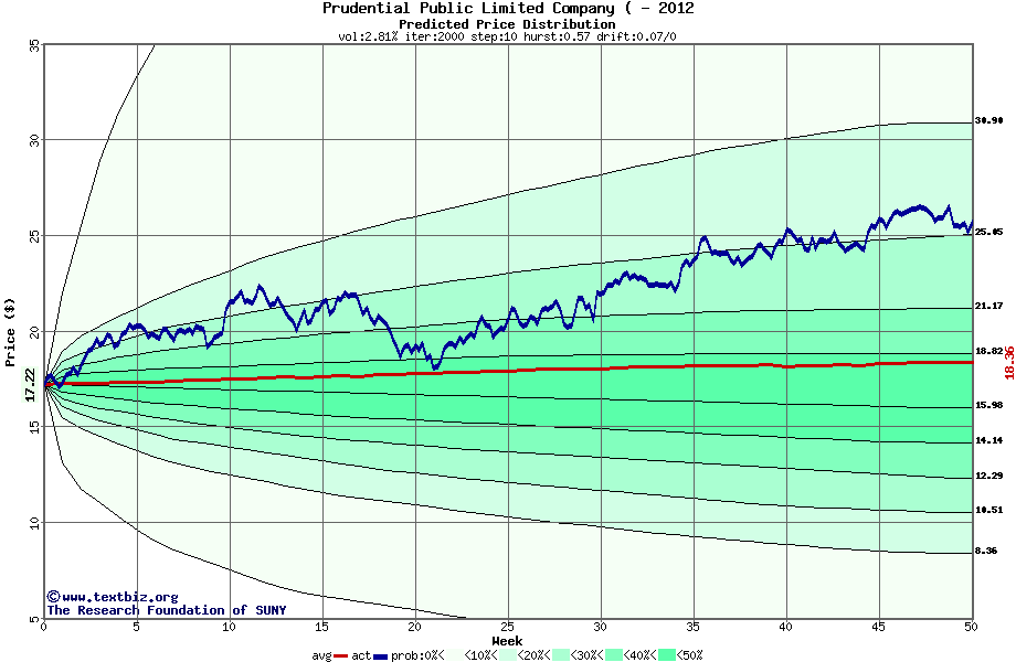 The following graph plots the year-to-date performance of the stock for 2012 compared to the probability calculated by a random walk model.
