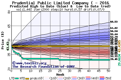 The high to date and low to date prices of the stock plotted against a random walk model for 2016 (what's this?).