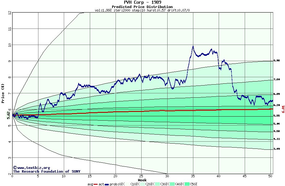The following graph plots the year-to-date performance of the stock for 1989 compared to the probability calculated by a random walk model.