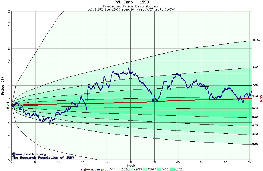 The high to date and low to date prices of the stock plotted against a random walk model for 1999 (what's this?).