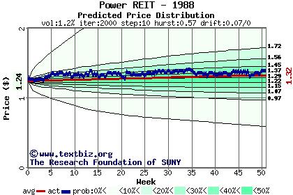 The high to date and low to date prices of the stock plotted against a random walk model for 1988 (what's this?).