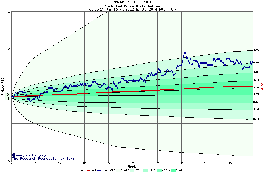 The following graph plots the year-to-date performance of the stock for 2001 compared to the probability calculated by a random walk model.