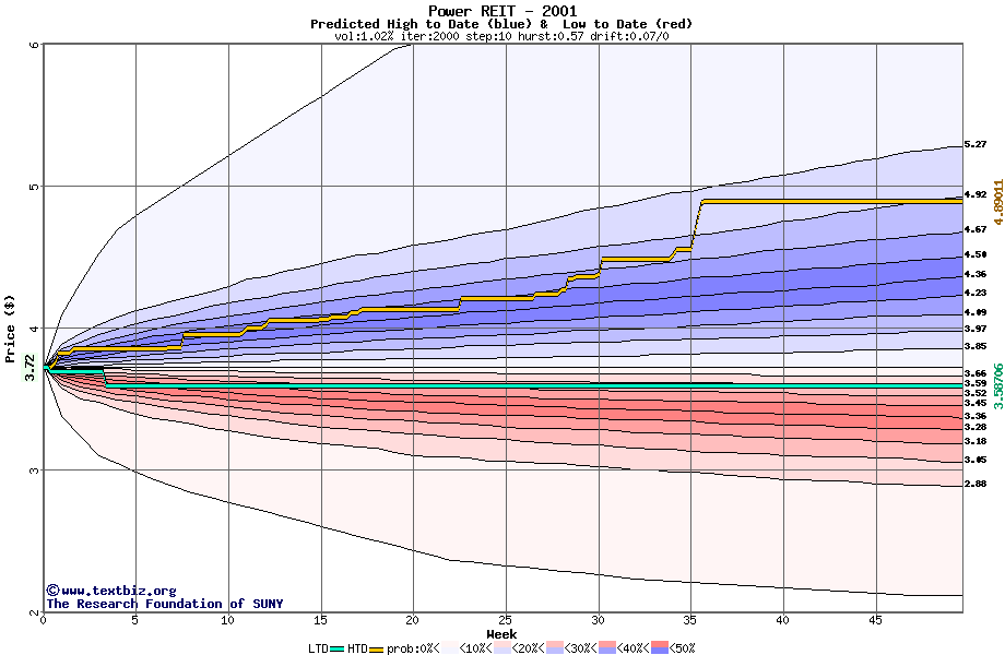 The high to date and low to date prices of the stock plotted against a random walk model for 2001 (what's this?).