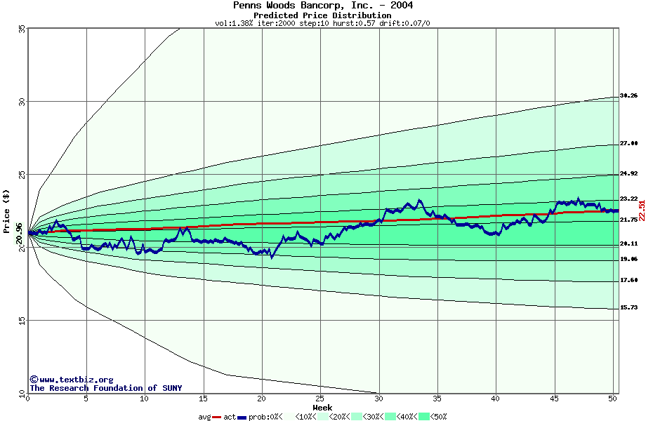 The following graph plots the year-to-date performance of the stock for 2004 compared to the probability calculated by a random walk model.