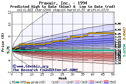 The high to date and low to date prices of the stock plotted against a random walk model for 1994 (what's this?).