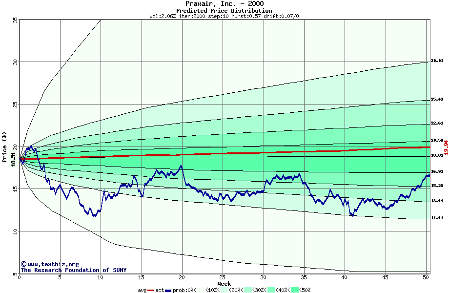 The following graph plots the year-to-date performance of the stock for 2000 compared to the probability calculated by a random walk model.