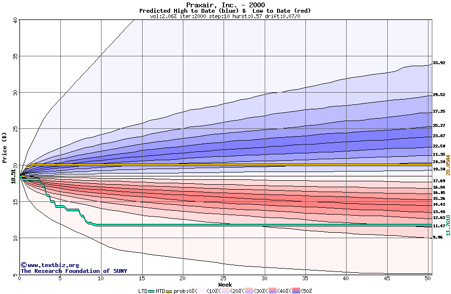 The high to date and low to date prices of the stock plotted against a random walk model for 2000 (what's this?).