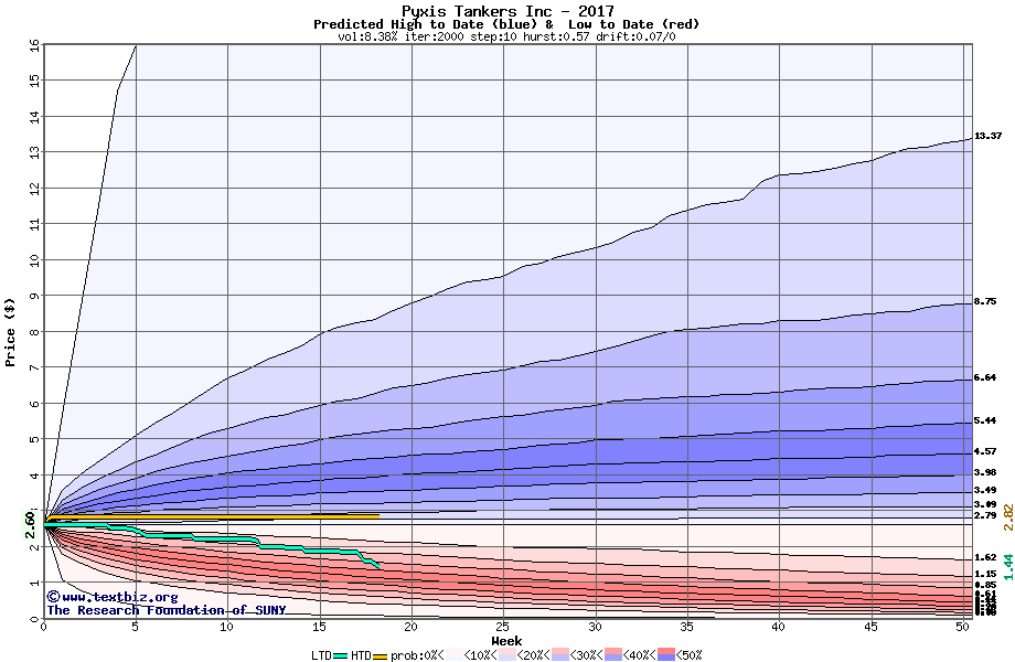 The high to date and low to date prices of the stock plotted against a random walk model for 2017 (what's this?).