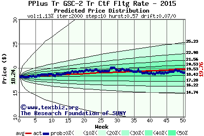 The high to date and low to date prices of the stock plotted against a random walk model for 2015 (what's this?).
