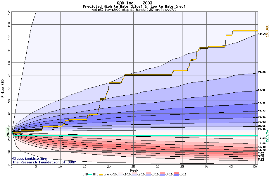 The high to date and low to date prices of the stock plotted against a random walk model for 2003 (what's this?).