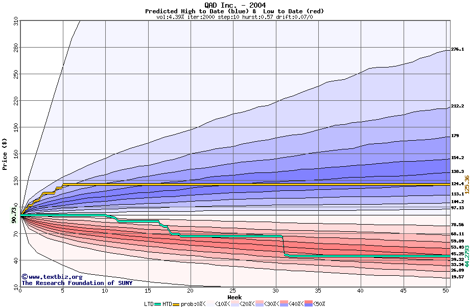 The high to date and low to date prices of the stock plotted against a random walk model for 2004 (what's this?).