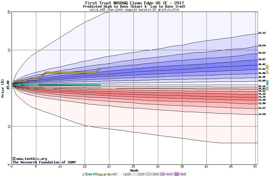 The high to date and low to date prices of the stock plotted against a random walk model for 2017 (what's this?).