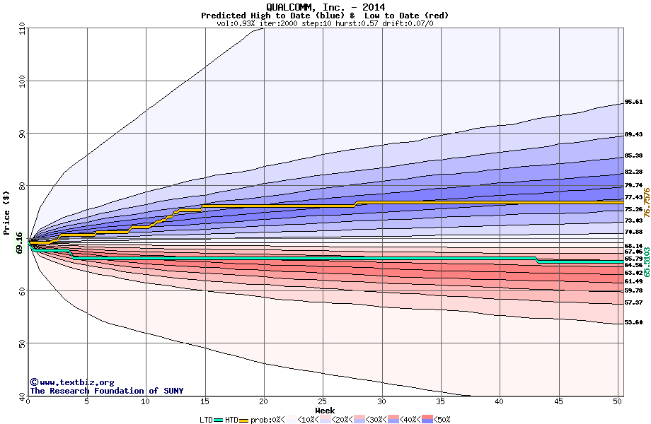 The following graph plots the year-to-date performance of the stock for 2014 compared to the probability calculated by a random walk model.