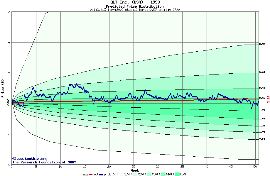 The following graph plots the year-to-date performance of the stock for 1993 compared to the probability calculated by a random walk model.