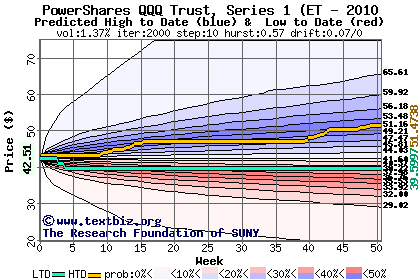 The high to date and low to date prices of the stock plotted against a random walk model for 2010 (what's this?).
