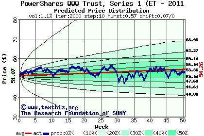 The high to date and low to date prices of the stock plotted against a random walk model for 2011 (what's this?).