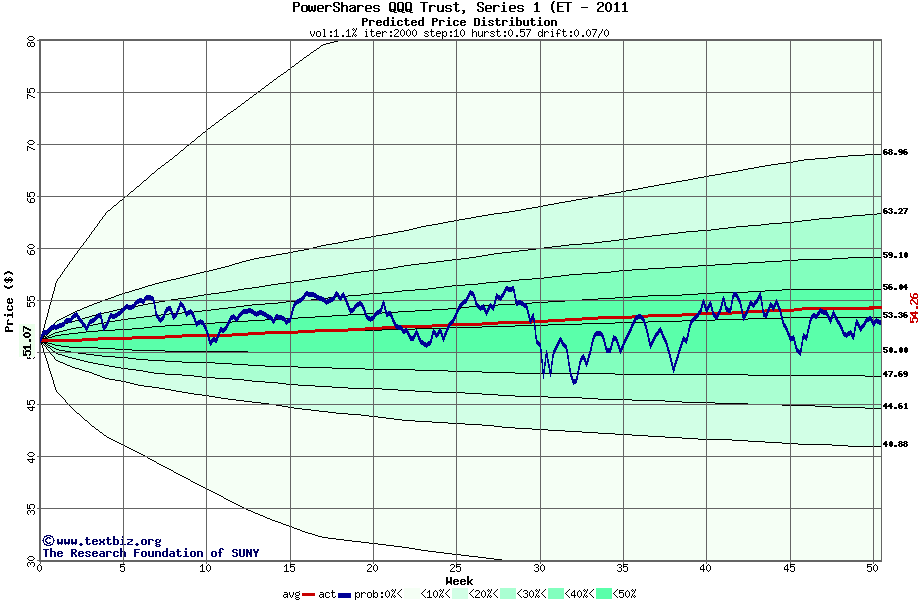 The following graph plots the year-to-date performance of the stock for 2011 compared to the probability calculated by a random walk model.