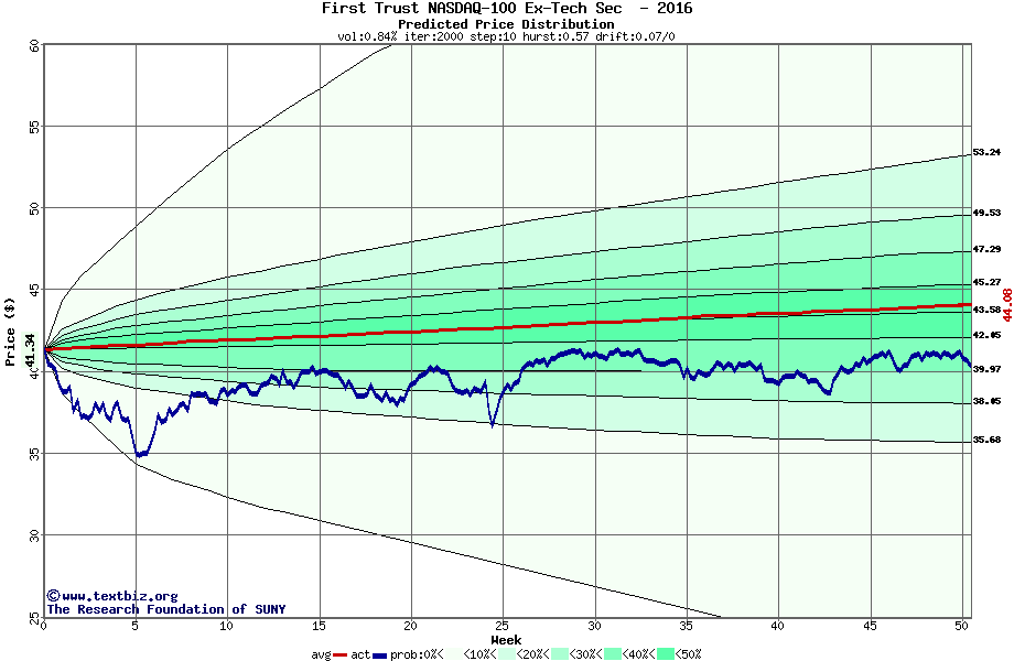 The following graph plots the year-to-date performance of the stock for 2016 compared to the probability calculated by a random walk model.
