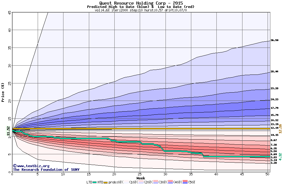 The high to date and low to date prices of the stock plotted against a random walk model for 2015 (what's this?).