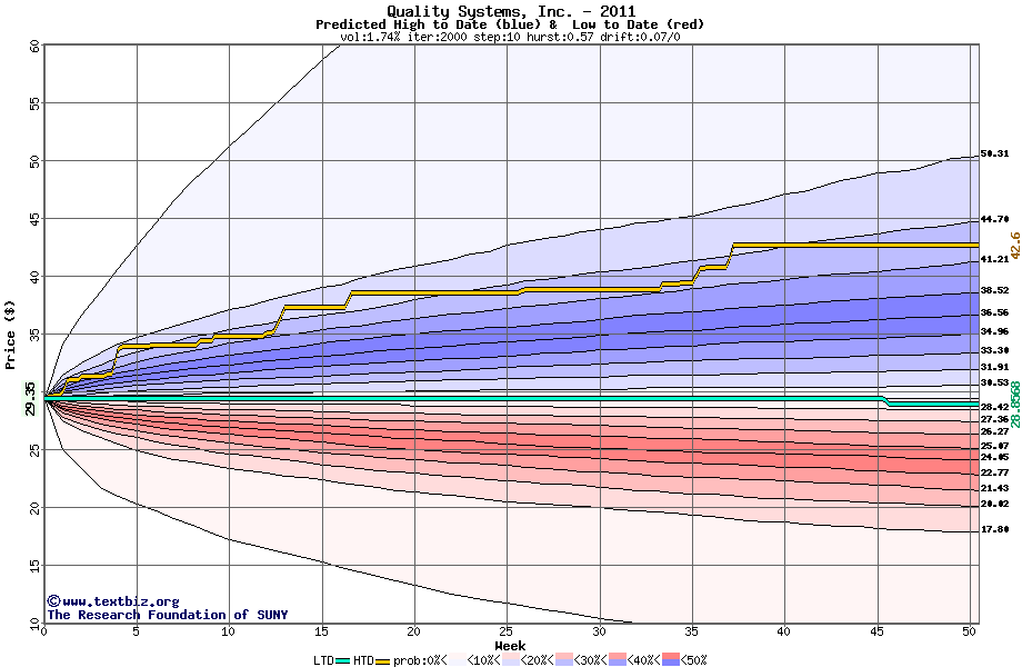 The high to date and low to date prices of the stock plotted against a random walk model for 2011 (what's this?).