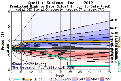 The high to date and low to date prices of the stock plotted against a random walk model for 2012 (what's this?).